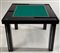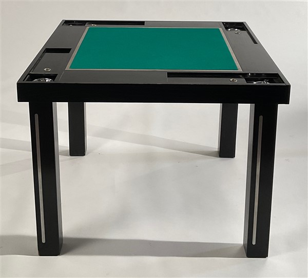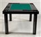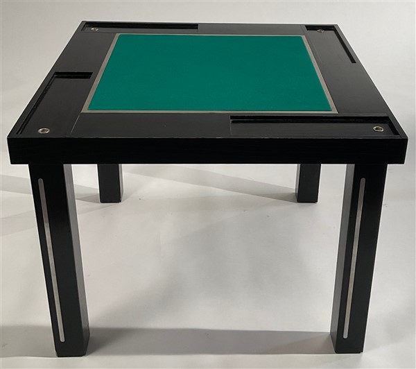 Tavolo da gioco. Italia, anni '70. Struttura in legno massello e laccato nero con elementi in metallo e ferro, piano rivestito in panno verde con quattro scomparti nella cornice con chiusura scorrevole celanti posaceneri in ferro. (cm 100x76x100) (difetti e mancanze)