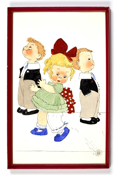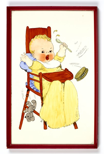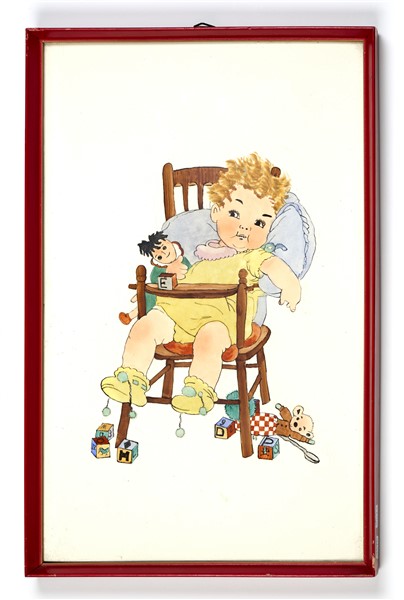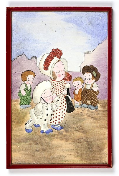 Gruppo di sei formelle in ceramica smaltata sotto vetrina in policromia decorate con neonati e bambini. Italia, 1935/1938. Siglate G. B. e datate (cm 37x23) In cornici di legno laccato rosso. (lievi difetti)