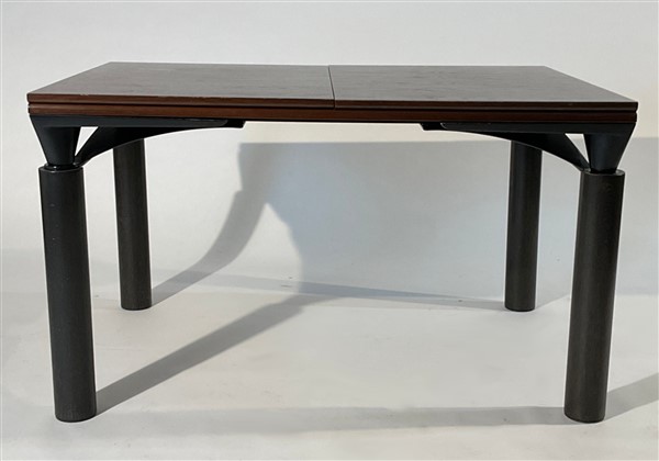 Tavolo in frassino scuro con piano apribile ad alette, ripiani angolari estraibili in legno laccato nero, gambe in legno laccato scuro. Produzione Cassina, Meda, anni '90. Recante etichetta adesiva del produttore sotto al piano. (cm 130x75,5x90) (difetti)