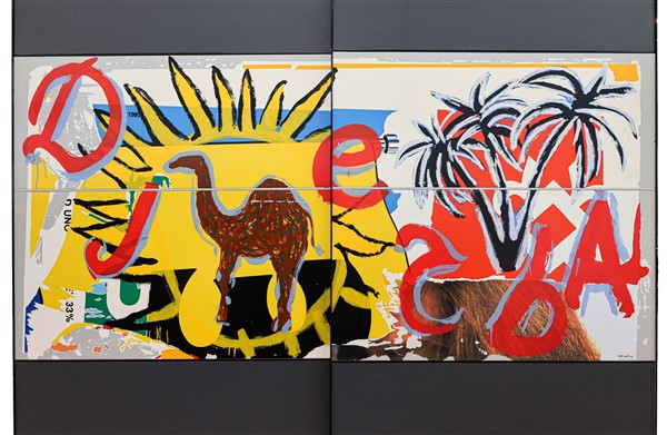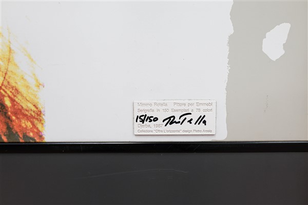 Armadio decorato con disegno di Mimmo Rotella della serie "Oltre L'orizzonte". Produzione Emmebi, Italia, 1987. Legno truciolare laccato nero e grigio e serigrafato sulla superifcie anteriore delle due ante scorrevoli, profili in metallo laccato nero e grigio. Recante etichetta iscritta "Mimmo Rotella Pittore per Emmebi Serigrafia in 150 Esemplari a 78 colori Djerba, 1987 Collezione 'Oltre L'orizzonte' design Pietro Arosio". Multiplo numerato 15/150 e firmato Rotella a mano. (cm 305x263x64,5) (difetti)