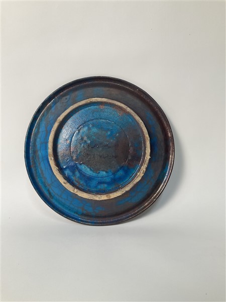 Piatto in ceramica decorato nei toni dell'azzurro ciano e rame a effetto craquelé. Faenza, seconda metà secolo XX. Firmato sotto la base. (d cm 29,5) (lievi difetti e restauri)