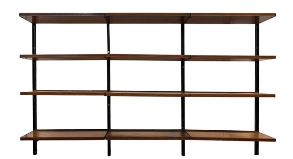 Libreria in legno e metallo verniciato a quattro montanti della serie "E22". Varedo, anni '70. Metallo e legno massello e impiallacciato. (cm 211x127x29) (difetti e manomissioni)