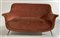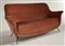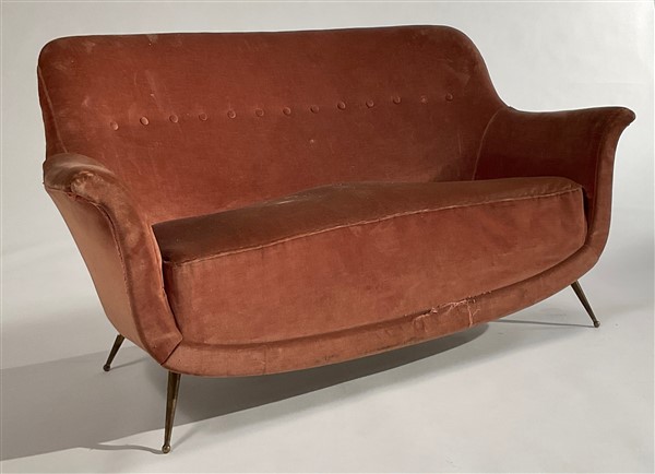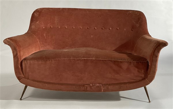 Divano a due posti rivestito in velluto color cipria, gambe in metallo ottonato. Italia, anni '50. (cm 147x78x60) (difetti e mancanze)