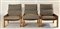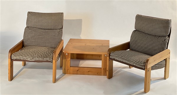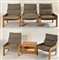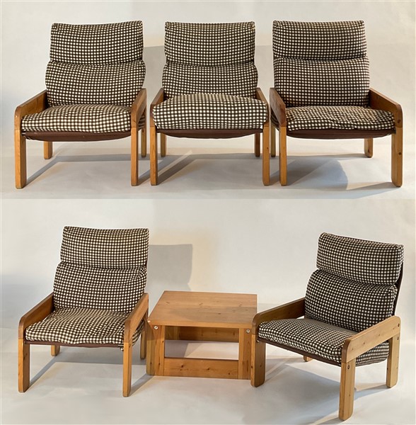 Lotto di cinque poltrone modello "Innovator". Svezia, 1973. Struttura in legno di abete massello e tubolare metallico, schienale e seduta in tela marrone, cuscini rivestiti in tessuto a riquadri bianchi e marroni. Unite a un tavolo da caffè ensuite. (poltrone cm 66x89x78; tavolino cm 71x37x71) (difetti)
