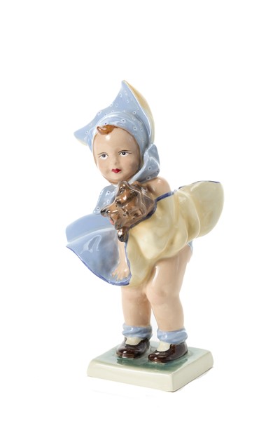 Scultura in ceramica formata a colaggio e smaltata in policromia sottovetrina raffigurante bambina con cucciolo. Capodimonte, anni '30/'40. Firmata a incussione sul fondo. (h cm 25)