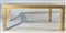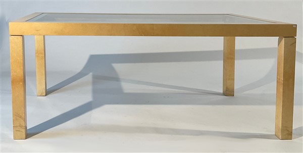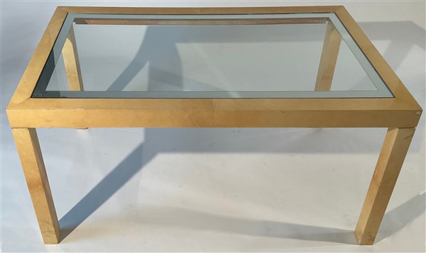Tavolo rivestito in pergamena verniciata al poliestere con piano in cristallo con bordo specchiato. Lazzate, a6080. (cm 170x74x90) (lievi difetti)