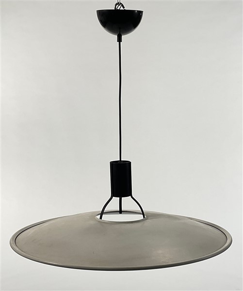 Lampada a sospensione modello "2133". Produzione Arteluce, Milano, anni '70. Metallo laccato nero e diffusore in alluminio stampato laccato bianco. Etichetta del produttore. (h cm 65; d cm 62) (lievi difetti)