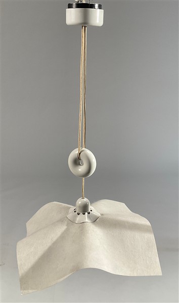 Lampada a sospensione saliscendi modello "Area". Produzione Artemide, Italia, anni '70. Struttura in. diffusore in carta rinforzata con fibre di vetro ed elementi plastici. (cm 43,5x45; altezza variabile) (lievi difetti)