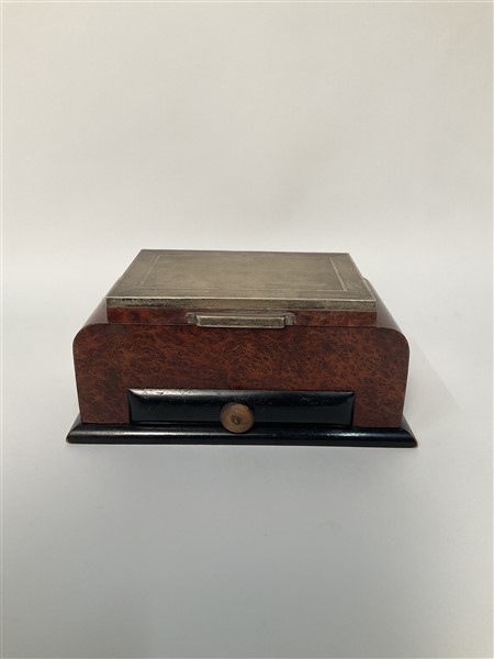 Scatola in legno e metallo, coperchio laminato in argento. Italia, anni '30. (c
