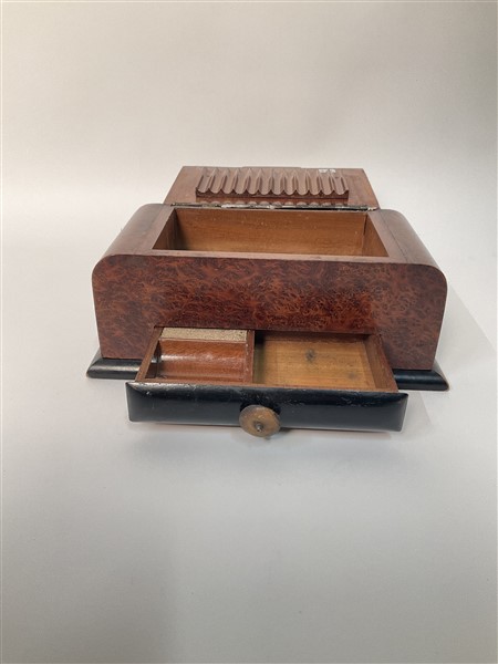 Scatola in legno e metallo, coperchio laminato in argento. Italia, anni '30. (cm 24x11x12) (difetti)