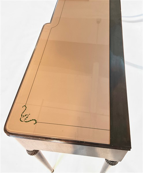 Console in legno impiallacciato e intarsiato nei ripiani della fascia superiore, tre cassetti nella lunghezza, piano in vetro retroverniciato e sei gambe rastremate intagliate. Italia, anni '50. (cm 218x91x47) (difetti)