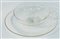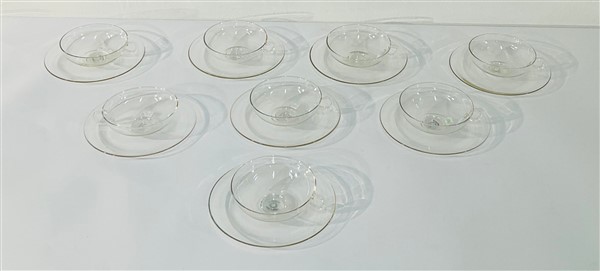 Otto tazzine con piattino in vetro trasparente incolore. Produzione Jena glass, Germania, anni '30. Marcati all'acido.