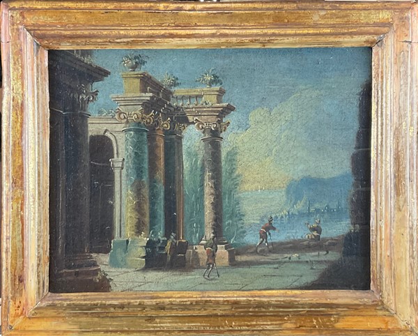 Scuola del secolo XVIII "Capriccio architettonico con figure" olio su tela (cm