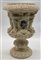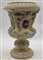 Manifattura di Bassano, inizio secolo XX. Vaso in maiolica bianca a balaustro con rilievi a teste zoomorfe, costolature e foglie, stemmi araldici dipinti in policromia entro riserva (h cm 39) (difetti)