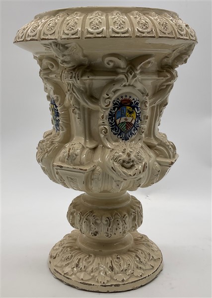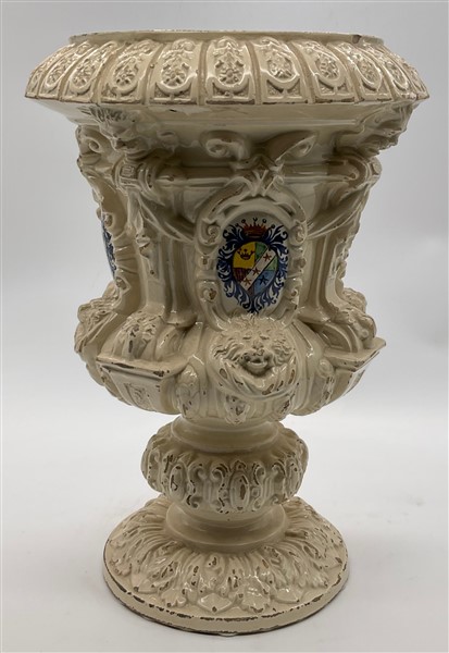 Manifattura di Bassano, inizio secolo XX. Vaso in maiolica bianca a balaustro con rilievi a teste zoomorfe, costolature e foglie, stemmi araldici dipinti in policromia entro riserva (h cm 39) (difetti)