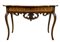 Antica console veneta in noce con piano sagomato e un cassetto nella fascia lastronati e filettati in radica, grembiale traforato e gambe mosse (cm 128x76x56) (difetti)