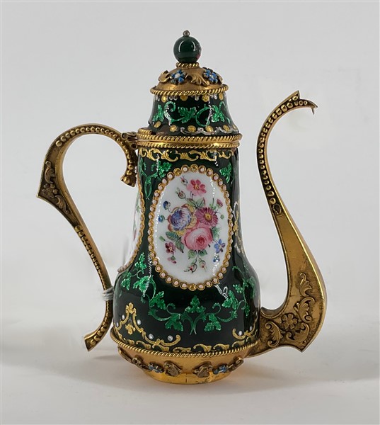 Piccola caffettiera in metallo dorato e smalti policromi con decoro a rilievo a volute e fiori, ansa e beccuccio con profili perlinati. Reca marchi russi, secolo XX (g lordi 150) (cm 11x13) (difetti)
