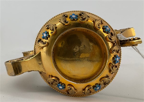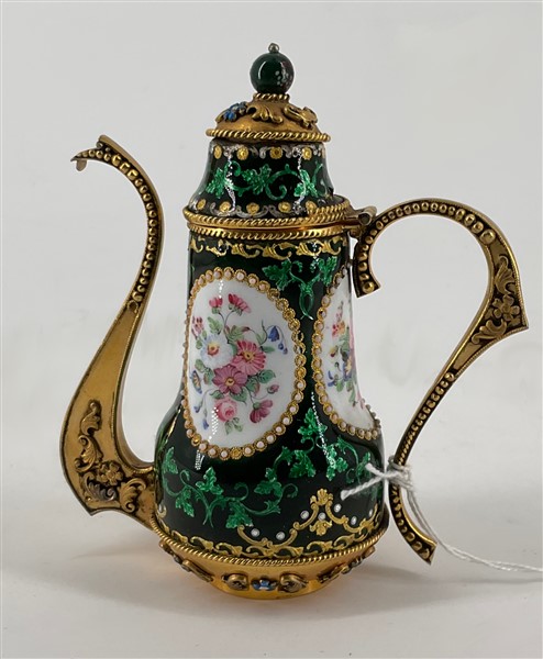 Piccola caffettiera in metallo dorato e smalti policromi con decoro a rilievo a