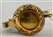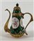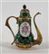 Piccola caffettiera in metallo dorato e smalti policromi con decoro a rilievo a