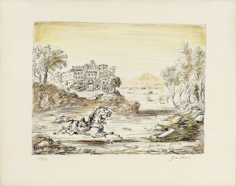 GIORGIO DE CHIRICO (1888-1978) Cavallo Fuggente 1954 - Fleeting Horse litografia - lithograph, es 122/125, firmata, al verso tracce di nastro adesivo lungo gli angoli superiori, reca timbri a secco Carlo Bestetti Edizioni d'Arte Roma, Libreria Prandi Reggio Emilia matrice cm 34x43,5, foglio cm 47,8x60 Bibliografia: A. Ciranna, G. de Chirico, Catalogo dell'opera grafica 1921-1969, Milano, n 123 - Published work
