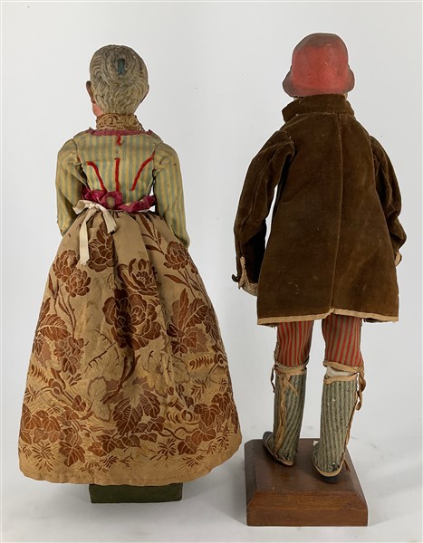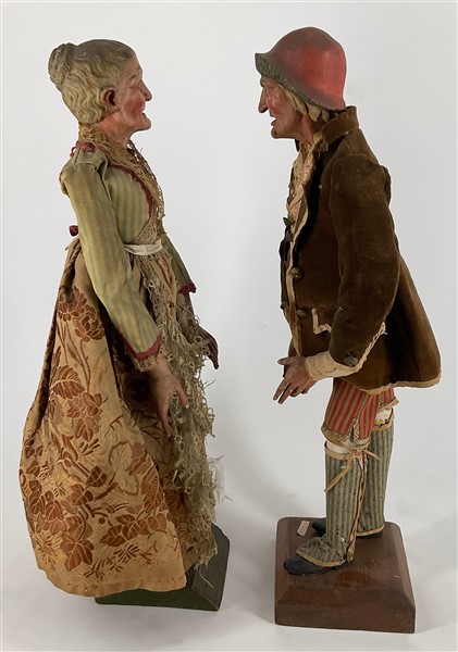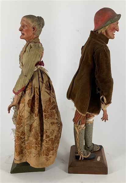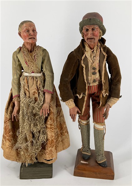 Arte napoletana, secolo XIX. Due figure popolari da presepe in legno e terracotta dipinti in policromia con occhi in pasta vitrea, abiti in tessuti diversi. Basi in legno di epoca successiva (h tot. cm 44 e 44,5) (difetti)