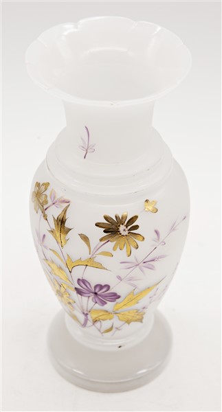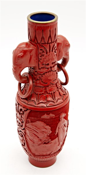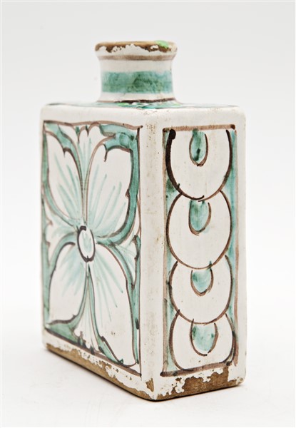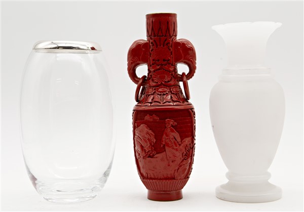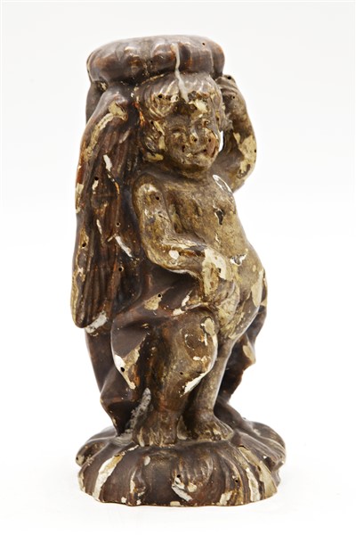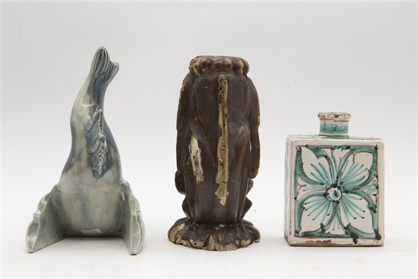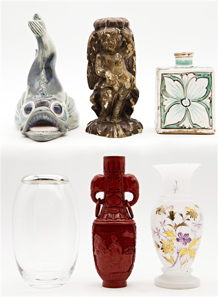 Lotto composto da sei oggetti diversi tra cui un delfino in porcellana, un antico candeliere in legno intagliato e dorato, un vaso cinese in lacca rossa, una fiasca in maiolica policroma e due vasi in vetro. Secolo XIX-XX (difetti)