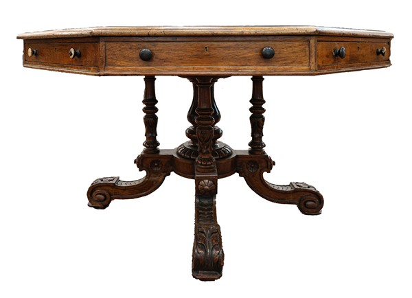 Tavolo di forma ottagonale in legni vari, piano con riserva in pelle impressa, quattro cassetti e quattro finti cassetti nella fascia, sostegno terminante a quattro gambe mosse (d cm 130, h cm 76) (difetti)