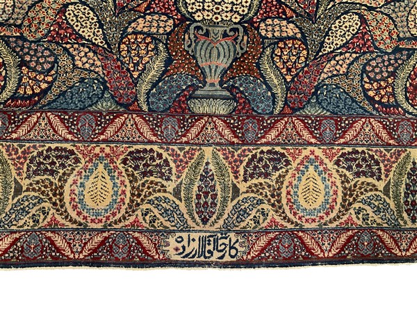 Tappeto Kirman, Persia, secolo XX. Decoro millefleur all over con motivi Boteh e di rami fioriti che in alcune riserve riproducono la corona dello scià di Persia in policromia su fondo blu notte. Bordura a riserve fiorite su fondo bianco. Cartiglio ad una testata con scrittura in persiano antico (cm 385x282) (difetti e rapature)