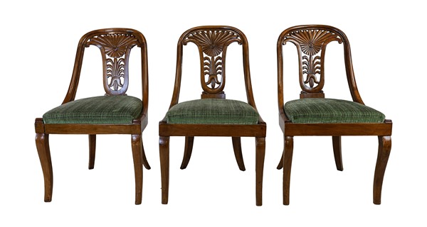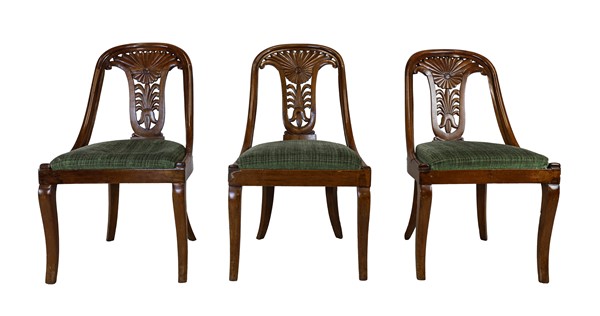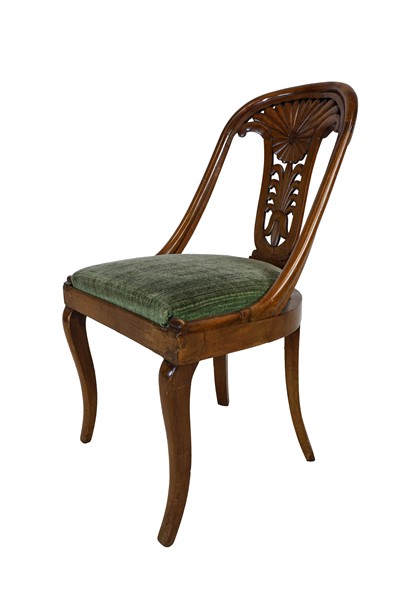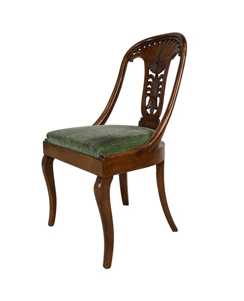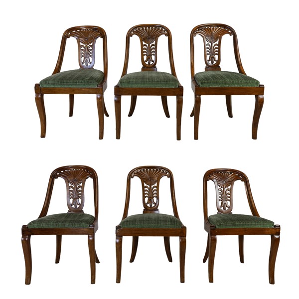Gruppo di sei sedie a gondola in noce con schienale a giorno intagliato e traforato a palmetta, gambe mosse e posteriori a sciabola. Secolo XIX (difetti)