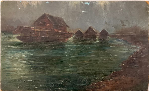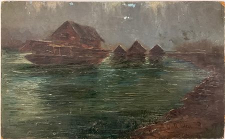 Ignoto di inizio secolo XX "Casoni sulla Laguna" olio su cartone pressato (cm
