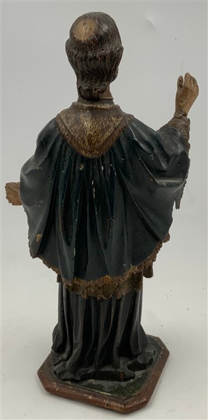 Scultore del secolo XVIII. Figura di Santo in legno intagliato e laccato (h cm 30) (difetti e mancanze)