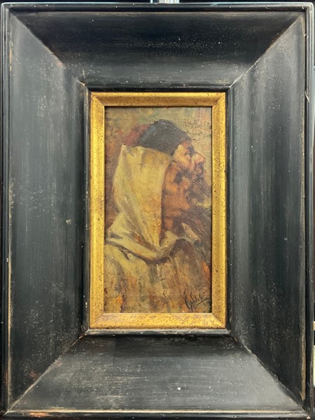 Nazzareno Sidoli "Coppia di uomini di profilo" olio su cartone (cm 23x12) firma