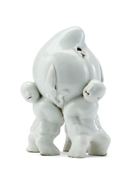 Gruppo scultoreo in porcellana blanc de Chine, raffigurante tre bambini che sor