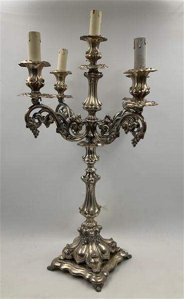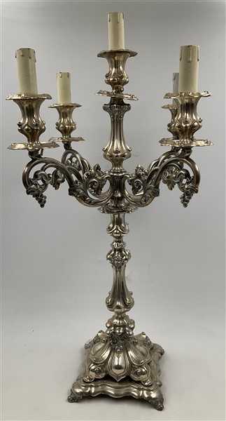 Lotto 1104 | Candelabro a cinque fiamme in metallo argentato e decorato a volute e grappoli