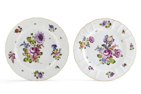 Manifattura di Samson, secolo XIX. Coppia di piatti a profilo mistilineo in porcellana decorata in policromia con mazzi di fiori. Marcati sotto la base (d. cm 24,5) (difetti)