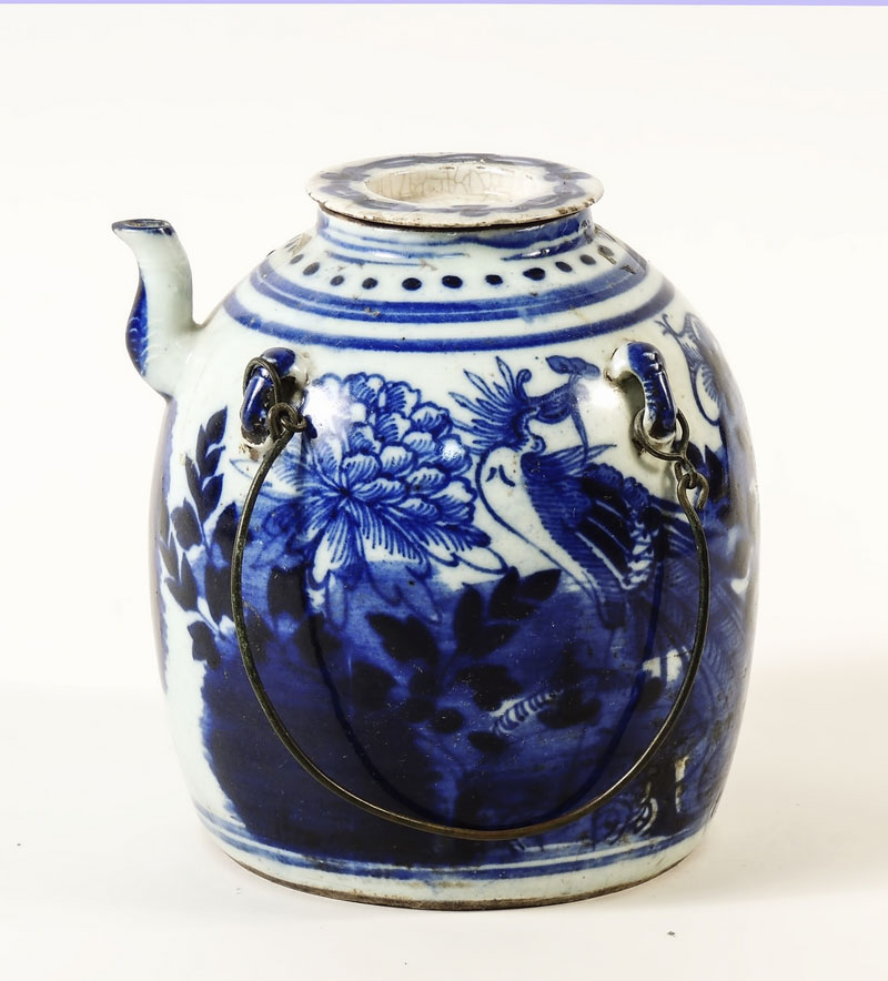 TEIERA IN PORCELLANA - PORCELAIN TEAPOT CINA, inizio del XX secolo - China, early 20th Century corpo cilindrico, manici in metallo, dipinta in monocromia blu con motivi floreali