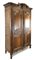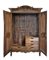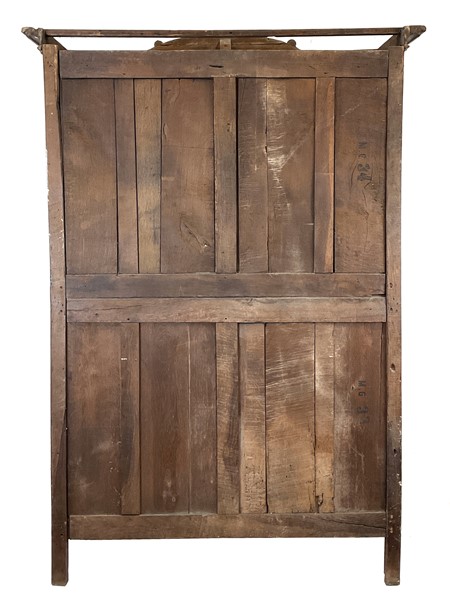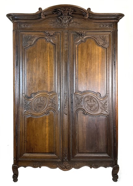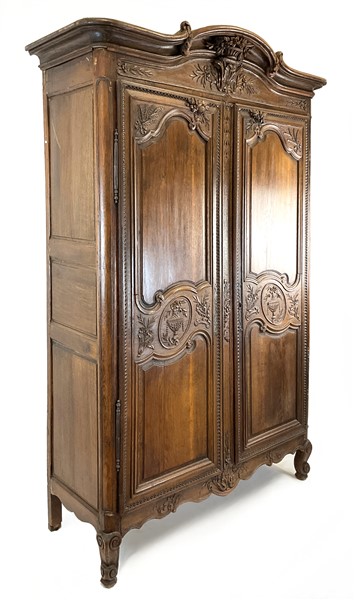 Armadio a due ante in rovere intagliato con decori a vasi fioriti entro medaglione e motivi floreali entro riserve mistilinee scanalate, cimasa a volute contrapposte centrata da motivo a cesto fiorito. Francia, secolo XVIII (cm 154x233x62). Interno con cassetti d'epoca successiva (difetti)