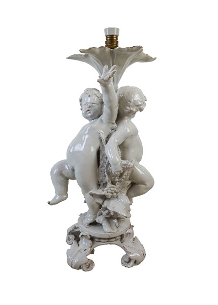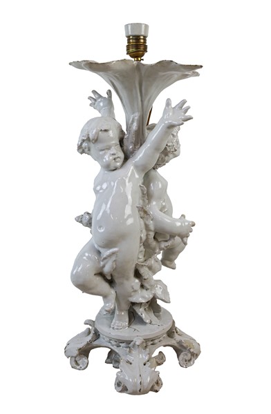Lotto 1243 | Lampada d'appoggio con sostegno in ceramica bianca a forma di putti su base sag