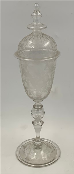 Manifattura boema, secolo XIX-XX. Calice con coperchio in cristallo inciso a vo