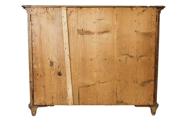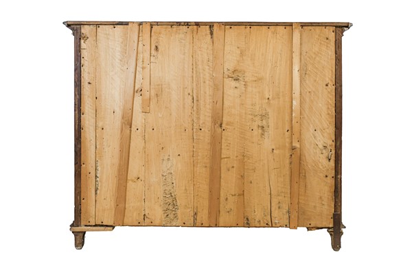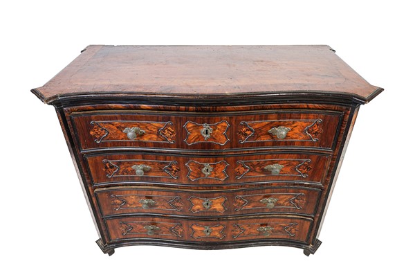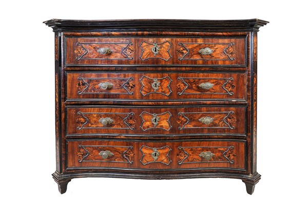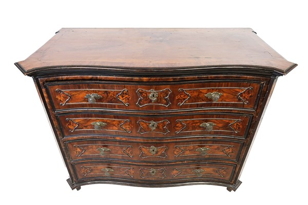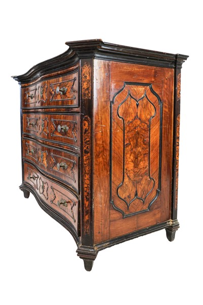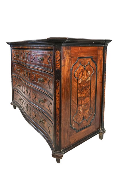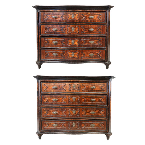Coppia di cassettoni in noce e radica di noce con fronte mosso a quattro cassetti, cornici e bordure ebanizzate. Lombardia, secolo XVIII. (cm 136x105x67) (difetti e sostituzioni)