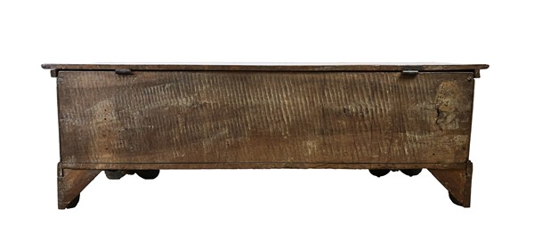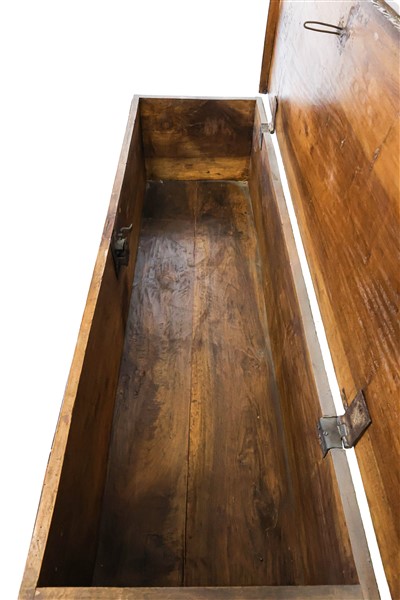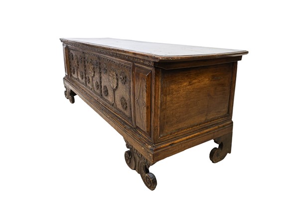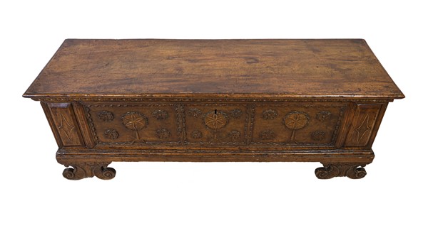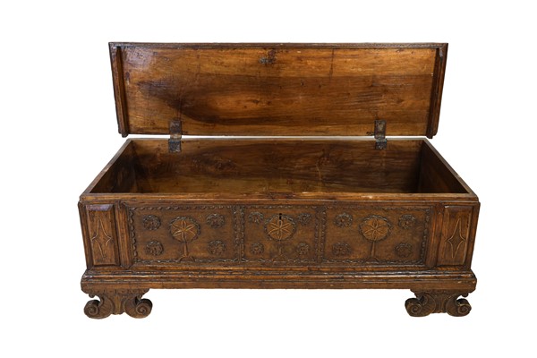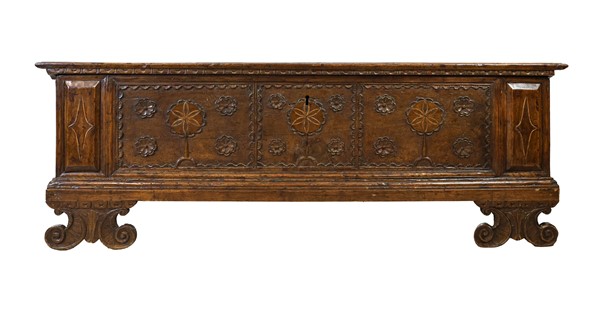 Cassapanca in noce e legni vari con fronte decorato da motivi stilizzati a rilievo, piedi anteriori a volute. (cm 158x55x47) (difetti)