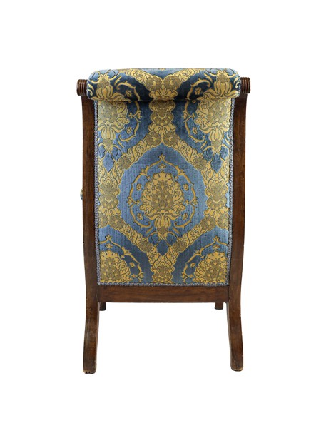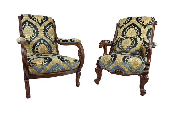 Due diverse poltrone in legni vari decorate da intagli con schienale e seduta rivestiti in velluto e fili di metallo argentato (difetti)