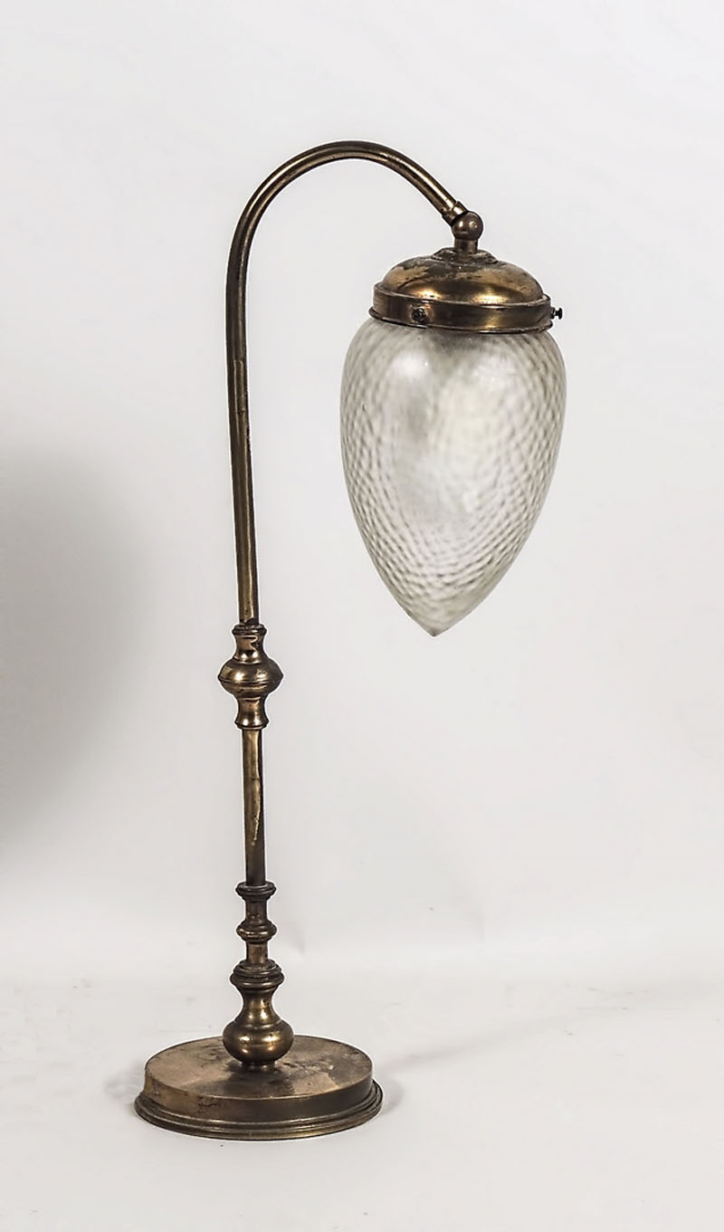 LUME DA TAVOLO IN OTTONE - BRASS TABLE LAMP inizio del XX secolo - early 20th Century bobeche a pigna in vetro satinato h cm 49