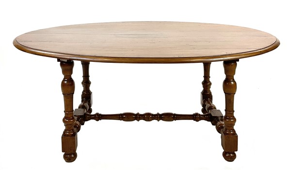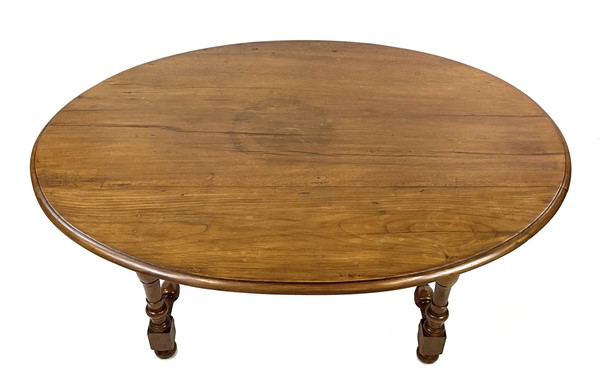 Tavolo da salotto in noce con piano ovale, gambe e traverse tornite (cm 124x57x