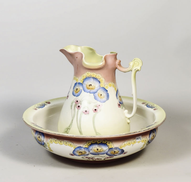 SET DA TOILETTE IN TERRAGLIA - POTTERY TOILET SET composto da un bacile ed un versatorio, decorato con fiori nei toni pastello (2)