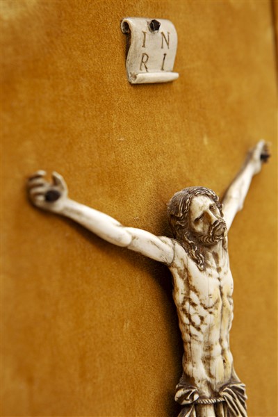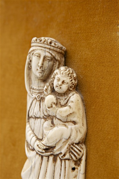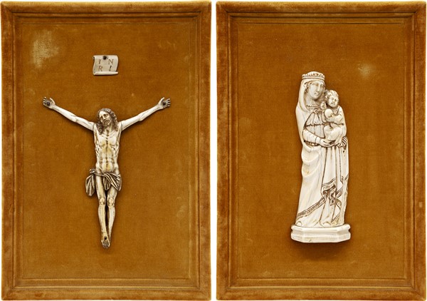 Arte del secolo XIX. Lotto composto da "Madonna con Bambino" (h cm 21) e "Cristo crocifisso" (h cm 20x16) in avorio intagliato, applicati su pannelli rivestiti in velluto d'epoca successiva (cm 37x26) (difetti e restauri)