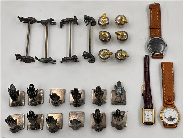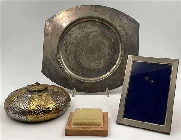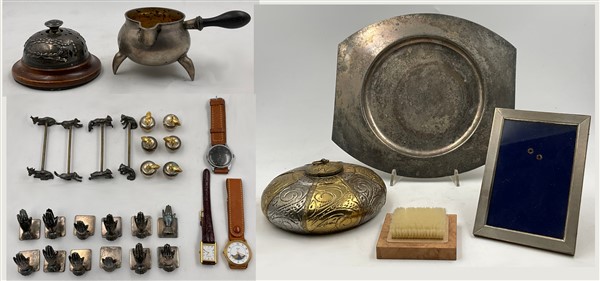 Scatola contenente alcuni oggetti in argento e altro materiale tra cui un campanello da tavolo inglese, un piccolo versatoio, una cornice portafoto, altri oggetti in metallo argentato e tre orologi da polso. (difetti)