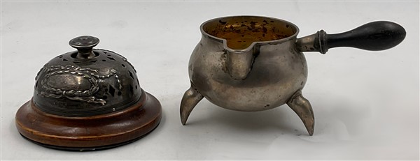 Lotto 1409 | Scatola contenente alcuni oggetti in argento e altro materiale tra cui un campa