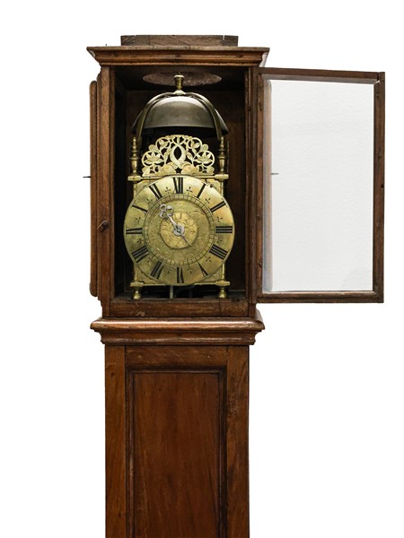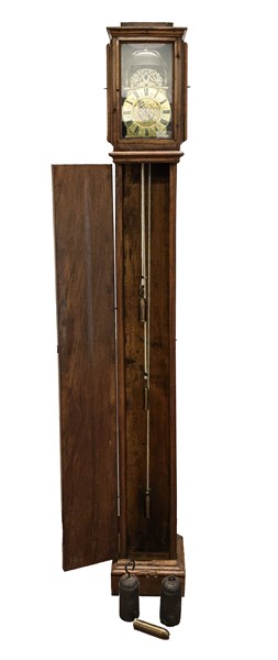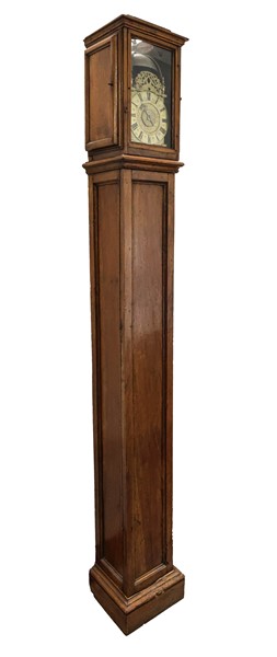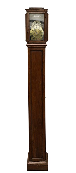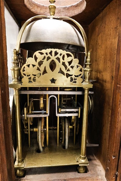 Quadrante a disco a cifre romane firmato Geo Brooke London. Movimento a due treni con suoneria delle ore su campanello. Racchiuso in cassalunga probabilmente non originale.