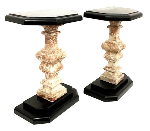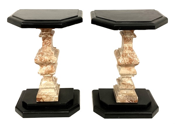 Lotto 1425 | Coppia di tavoli bassi da parete in marmi vari con fusto a balaustro, base e pi